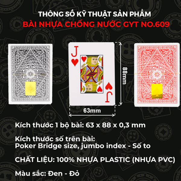 Bài Nhựa GYT 609 Là Dòng Bài Số To ( Jumbo Index) Được In Với Size To Hơn Kể Cả Lá Bài, Các Chữ và Số Trong Bài. Các Quân Bài Từ 2 Đến Át Đều Có Ô Hình Chữ Nhật Viền Bao Quanh.