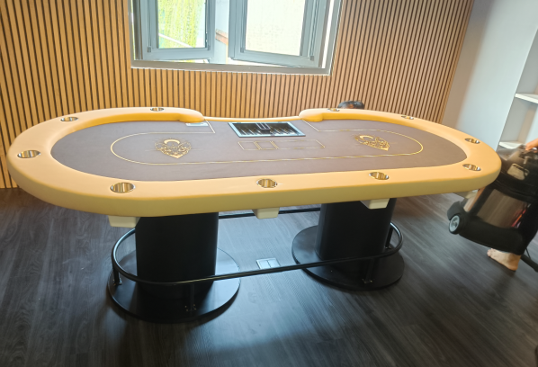 Bàn Poker Chuyên Nghiệp: được thiết kế theo tiêu chuẩn quốc tế có kích thước 80x120x240cm thường dành cho 10 người chơi. Bàn Poker được trang bị đầy đủ các phụ kiện như Tray, Rake, hệ thống Cup Holder chuyên nghiệp. Viền bạn được ốp da Micofiber Black cao cấp cho cảm giác êm ái khi tỳ tay và được bo viền kim loại trang trí sang trọng. Mặt bàn sử dụng gỗ cao cấp chịu lực tốt chống cong vênh mối mọt, mặt bàn sử dụng vải Gaming Suede chuyên dụng nhập khẩu từ châu âu, có khả năng kháng nước, chống nhăn, bề mặt bàn luôn láng mịn giúp quân bài lướt êm mượt. Chân bàn được ốp Melamine vân gỗ chống ẩm bền đẹp cùng thời gian. Đế chân bàn được ốp Melamine bi viền kim loại sang trọng.