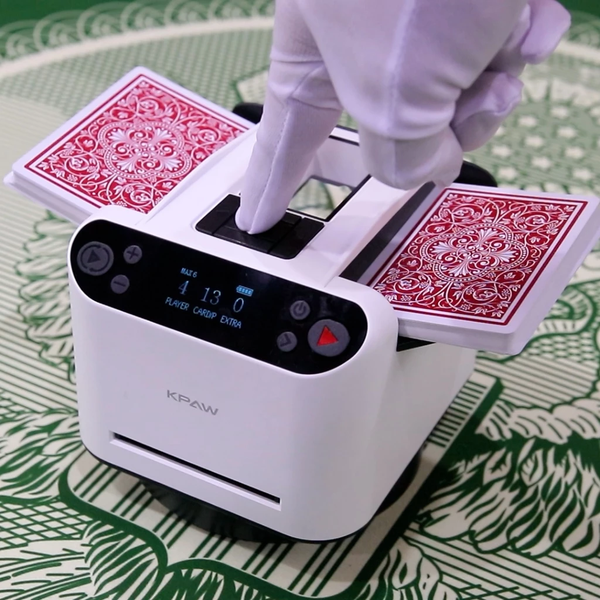 Máy Chia Xáo Bài Tự Động KPAW: là dòng máy vừa xáo bài vừa chia bài tự động mới hiện đại nhất hiện nay. Máy có dụng lượng pin 5200Mah giúp thời gian sử dụng lâu. Máy được trang bị các nút gọi thẻ không dây đến vị trí tuỳ chỉnh, đây là chức năng độc nhất chỉ có ở máy KPAW.