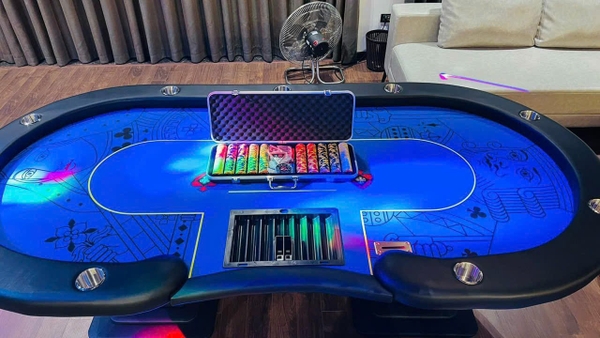 Bàn Poker Chuyên Nghiệp: được thiết kế theo tiêu chuẩn quốc tế có kích thước 80x120x240cm dành cho khoảng 10 người chơi. Bàn Poker được trang bị đầy đủ các phụ kiện như Tray, Rake, hệ thống Cup Holder chuyên nghiệp. Viền bạn được ốp da Micofiber Black cao cấp cho cảm giác êm ái khi tỳ tay và được bo viền kim loại trang trí sang trọng. Mặt bàn sử dụng gỗ cao cấp chịu lực tốt chống cong vênh mối mọt, mặt bàn sử dụng vải Gaming Suede chuyên dụng nhập khẩu từ châu âu, có khả năng kháng nước, chống nhăn, bề mặt bàn luôn láng mịn giúp quân bài lướt êm mượt. Chân bàn được ốp Melamine vân gỗ chống ẩm bền đẹp cùng thời gian. Đế chân bàn được ốp Melamine bi viền kim loại sang trọng.