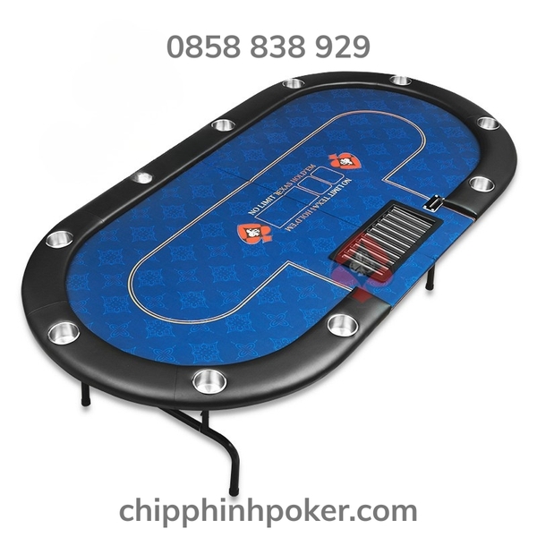 3. Mặt Bàn Poker Oval Gấp Gọn: kích thước 100x200cm, gấp đôi lại còn 1m vuông, tối đa 10 người chơi. Mặt bàn được làm từ vải chuyên dụng cao cấp luôn căng mịn giúp lá bài và chip poker lướt êm không bị kẹt rít, mặt bàn có nhiều hoa văn được thiết kế tỉ mỉ in chìm bền màu trên mặt vải, chịu lực rất tốt và dễ dàng để mặt bàn ở nhiều vị trí như sàn nhà, bàn làm việc, bàn ăn, bàn trà,... Viền bàn được bọc da cao cấp và trang bị 10 hốc để đồ uống tiện lợi, có túi thể thao đi kèm giúp dễ dàng cất mà mang theo người đến nhiều nơi.