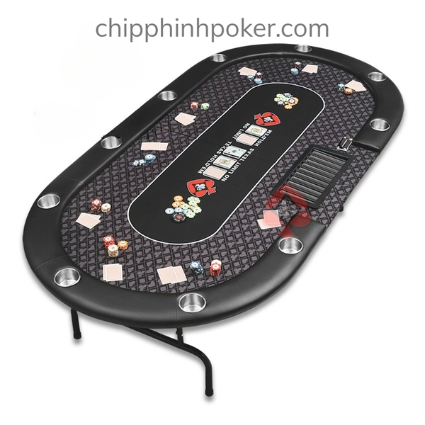 3. Mặt Bàn Poker Oval Gấp Gọn: kích thước 100x200cm, gấp đôi lại còn 1m vuông, tối đa 10 người chơi. Mặt bàn được làm từ vải chuyên dụng cao cấp luôn căng mịn giúp lá bài và chip poker lướt êm không bị kẹt rít, mặt bàn có nhiều hoa văn được thiết kế tỉ mỉ in chìm bền màu trên mặt vải, chịu lực rất tốt và dễ dàng để mặt bàn ở nhiều vị trí như sàn nhà, bàn làm việc, bàn ăn, bàn trà,... Viền bàn được bọc da cao cấp và trang bị 10 hốc để đồ uống tiện lợi, có túi thể thao đi kèm giúp dễ dàng cất mà mang theo người đến nhiều nơi.