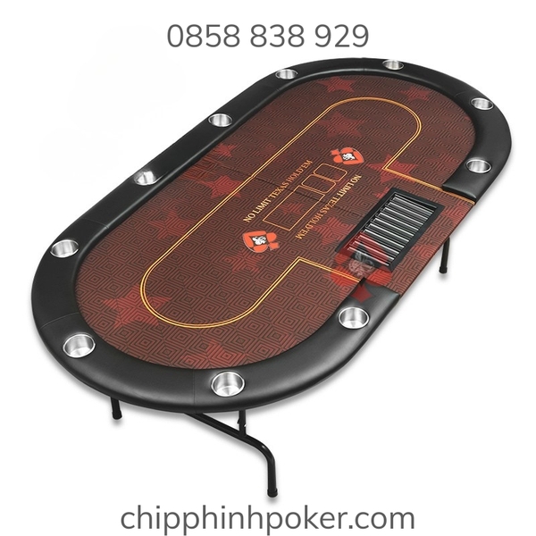 3. Mặt Bàn Poker Oval Gấp Gọn: kích thước 100x200cm, gấp đôi lại còn 1m vuông, tối đa 10 người chơi. Mặt bàn được làm từ vải chuyên dụng cao cấp luôn căng mịn giúp lá bài và chip poker lướt êm không bị kẹt rít, mặt bàn có nhiều hoa văn được thiết kế tỉ mỉ in chìm bền màu trên mặt vải, chịu lực rất tốt và dễ dàng để mặt bàn ở nhiều vị trí như sàn nhà, bàn làm việc, bàn ăn, bàn trà,... Viền bàn được bọc da cao cấp và trang bị 10 hốc để đồ uống tiện lợi, có túi thể thao đi kèm giúp dễ dàng cất mà mang theo người đến nhiều nơi.