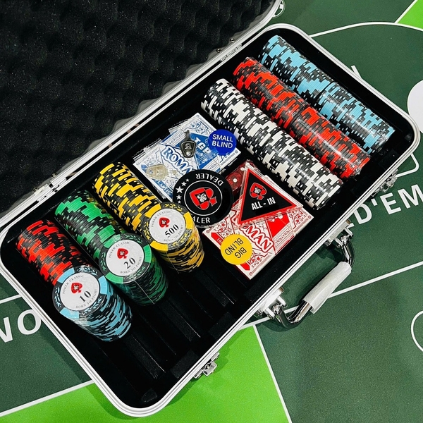 Ví Dụ 1 Bộ 500 Chip Gồm: 500 Quân Chip, 1 Vali Chống Sốc Sang trọng, 2 Bộ Bài Nhựa Poker được tặng, 1 Thẻ Dealer, 1 Thẻ Big Blind, 1 Thẻ Small Blind, 5 Xúc Xắc, 1 Thẻ All In, 2 chìa khóa vali.