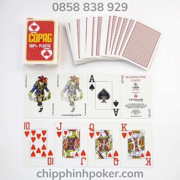Bài Nhựa Poker hay còn gọi là bài tây nhựa được làm từ hợp chất nhựa plastic 100%, bài số to dễ quan sát phù hợp để chơi Poker, Xì Tố, Xì Dách, Blackjack, Roulette, Baccarat, Phỏm, Tiến Lên, Tá Lả, ... Lá bài dày dặn chống nhăn chống cong vênh, chống thấm nước, có độ dẻo độ bóng cao giúp quân bài lướt êm không bị kẹt rít, cho cảm giác cầm bài rất thoải mái. Đặc biệt tránh được tình trạng đánh dấu quân bài, chống gian lận khi chơi bài.
