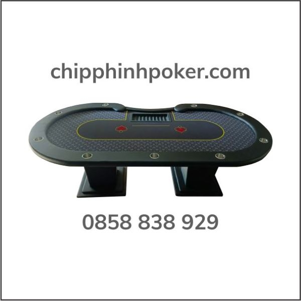Bàn Poker Chuyên Nghiệp Huế Cao Cấp: được thiết kế theo tiêu chuẩn quốc tế có kích thước 80x120x240cm thường dành cho 10 người chơi. Bàn Poker được trang bị đầy đủ các phụ kiện như Tray, Rake, hệ thống Cup Holder chuyên nghiệp. Viền bạn được ốp da Micofiber Black cao cấp cho cảm giác êm ái khi tỳ tay và được bo viền kim loại trang trí sang trọng. Mặt bàn sử dụng gỗ cao cấp chịu lực tốt chống cong vênh mối mọt, mặt bàn sử dụng vải Gaming Suede chuyên dụng nhập khẩu từ châu âu, có khả năng kháng nước, chống nhăn, bề mặt bàn luôn láng mịn giúp quân bài lướt êm mượt. Chân bàn được ốp Melamine vân gỗ chống ẩm bền đẹp cùng thời gian. Đế chân bàn được ốp Melamine bi viền kim loại sang trọng.