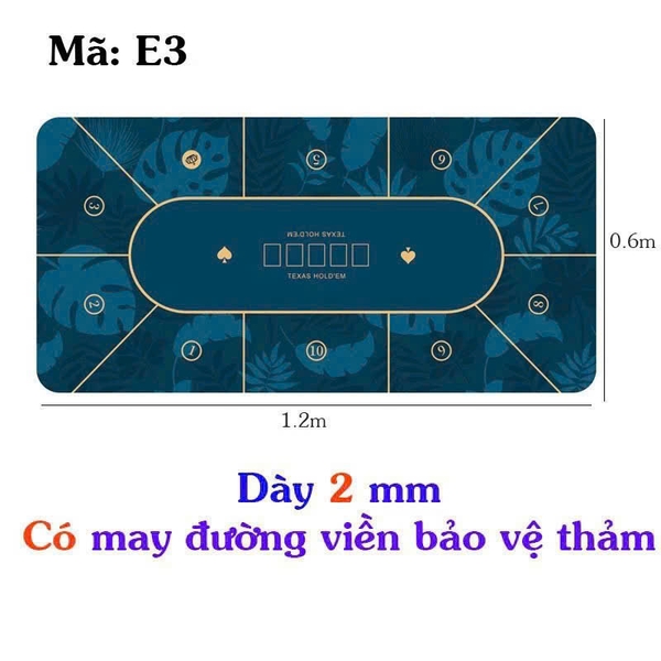 Thảm Poker Cao Su: Thảm được làm từ chất liệu cao su có 3 lớp thảm nên nặng và lớp cuối cùng được thiết kế rãnh nhỏ giúp thảm bám chắc sàn không lo xô lệch thảm khi chơi, bề mặt thảm nhẵn phẳng giúp quân bài lướt êm. Thảm có thể vệ sinh giặt sạch mà không lo hỏng, thảm được cuộn lại, trọng lượng thảm khoảng 1,5kg đựng trong túi nên dễ dàng mang theo người.