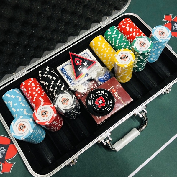 Ví Dụ Một Bộ 500 Chip Poker gồm: 1 Vali đựng sang trọng, 500 Chip Poker, 2 bộ Bài Nhựa Poker, thẻ Dealer, thẻ Big Blind, thẻ Small Blind, 5 Xúc Xắc, 1 thẻ All In.