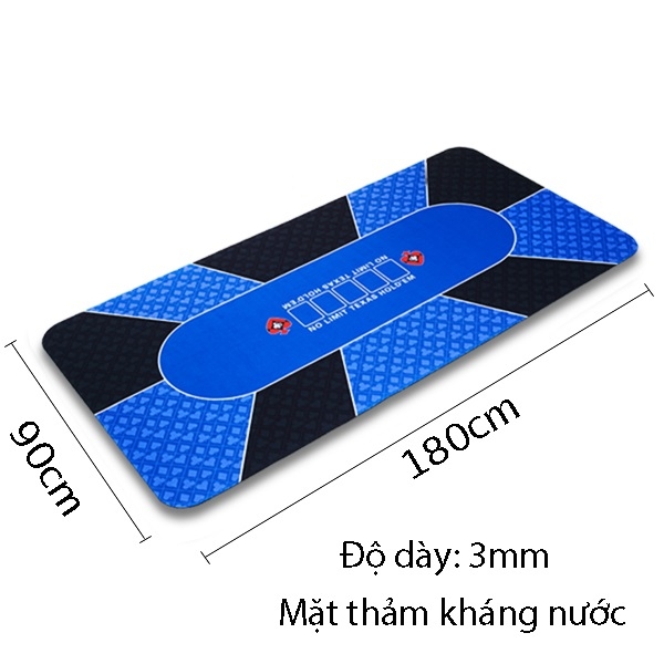 Thảm poker được sử dụng nhiều do tính cơ động dễ di chuyển theo người, Hiện tại trên thị trường có các mẫu thảm poker: thảm nỉ, thảm vải, thảm cao su. Kích thước thảm poker 90x180cm chơi tối đa 10 người, thảm poker 60x120cm chơi tối đa 6 người, thảm poker 75x150cm chơi tối đa 8 người.